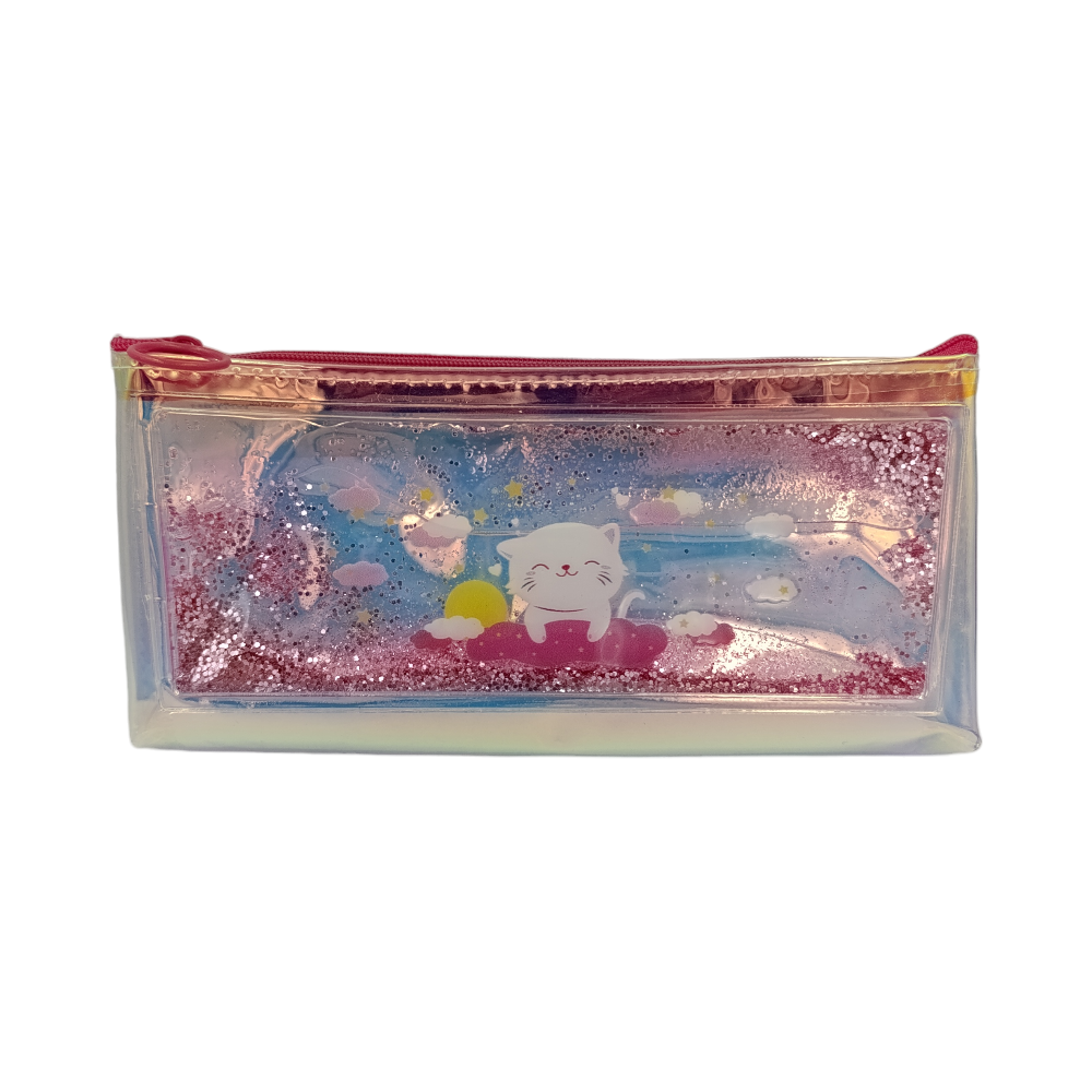 Η κασετίνα αυτή με την γατούλα έχει το μοναδικό χαρακτηριστικό με το glitter μέσα στο νερό! Είναι διάφανη με ιριδίζουσα απόχρωση.
