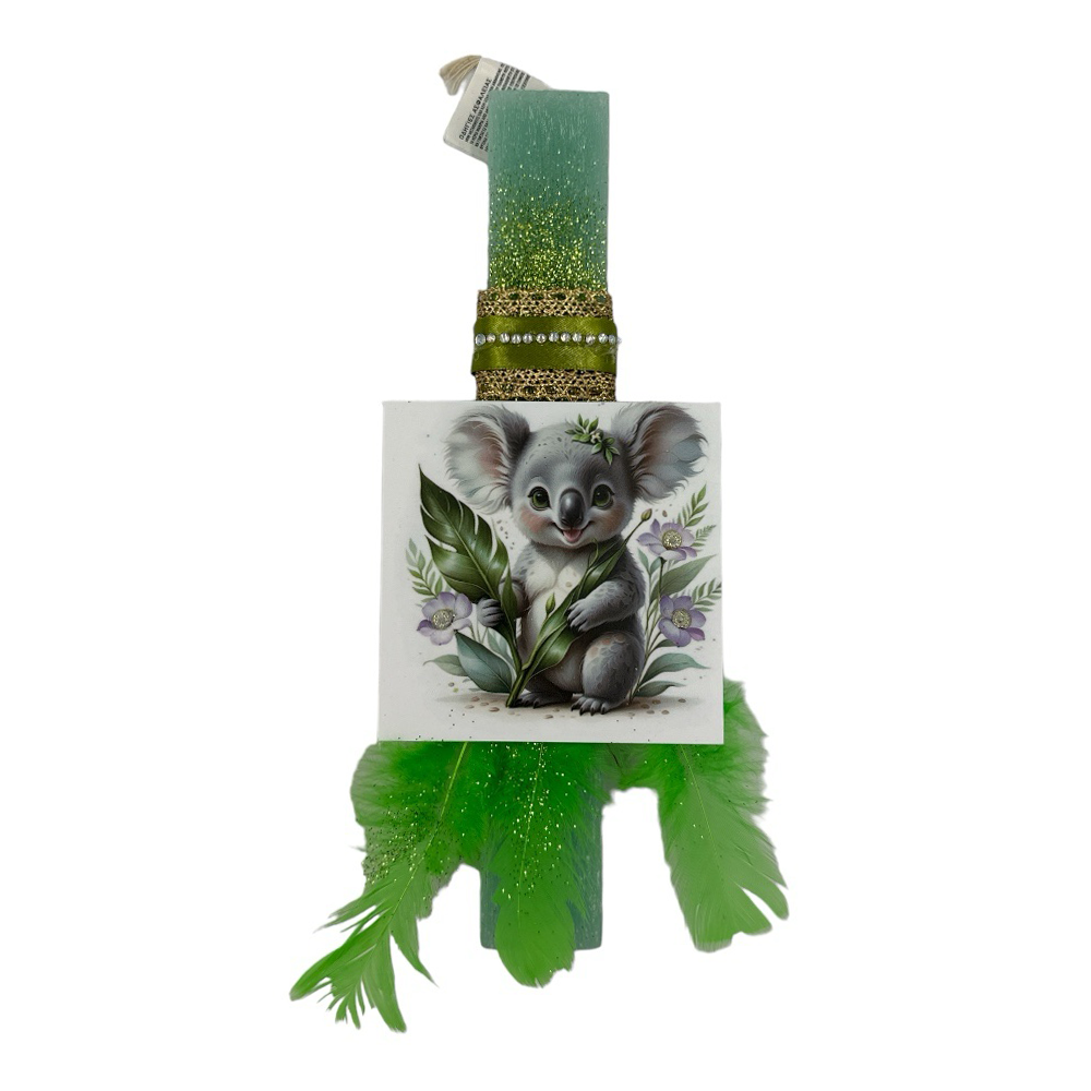Λαμπάδα χειροποίητη πλακέ αρωματική Κοάλα καδράκι με πούπουλα 26 εκ