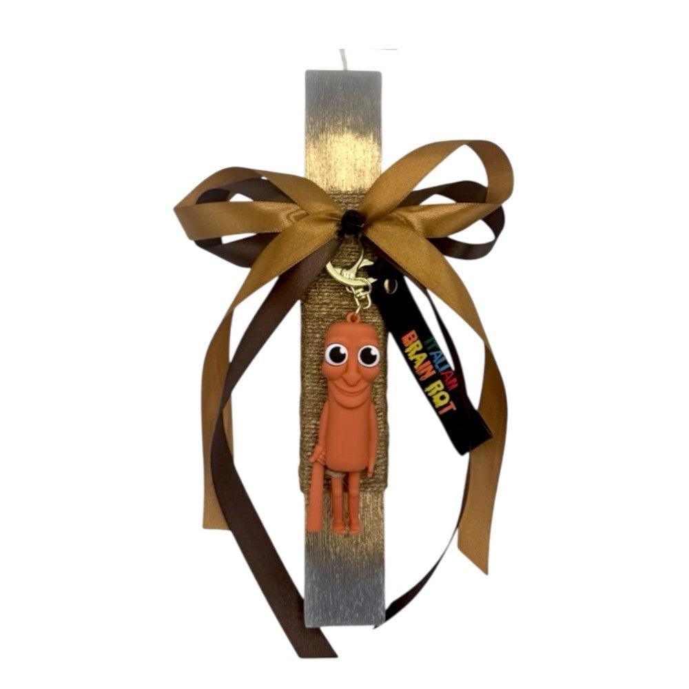 Μια ιδιαίτερη και μοντέρνα πασχαλινή λαμπάδα εμπνευσμένη από το viral trend Tung Tung Tung Sahur Brainrot. Η χειροποίητη πλακέ αρωματική λαμπάδα είναι διακοσμημένη με μπρελόκ με το συγκεκριμένο θέμα, δημιουργώντας ένα πρωτότυπο και ξεχωριστό αποτέλεσμα.