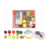 Το σετ περιλαμβάνει διάφορα φρούτα που χωρίζονται στη μέση με Velcro, καθώς και πλαστικό μαχαίρι και επιφάνεια κοπής, ώστε τα παιδιά να «κόβουν» και να «ξαναενώνουν» τα κομμάτια με ασφάλεια.