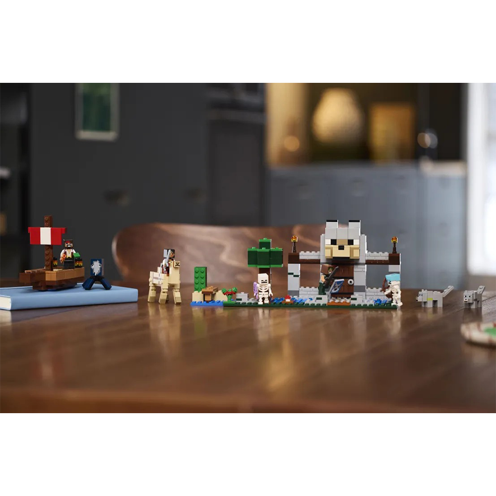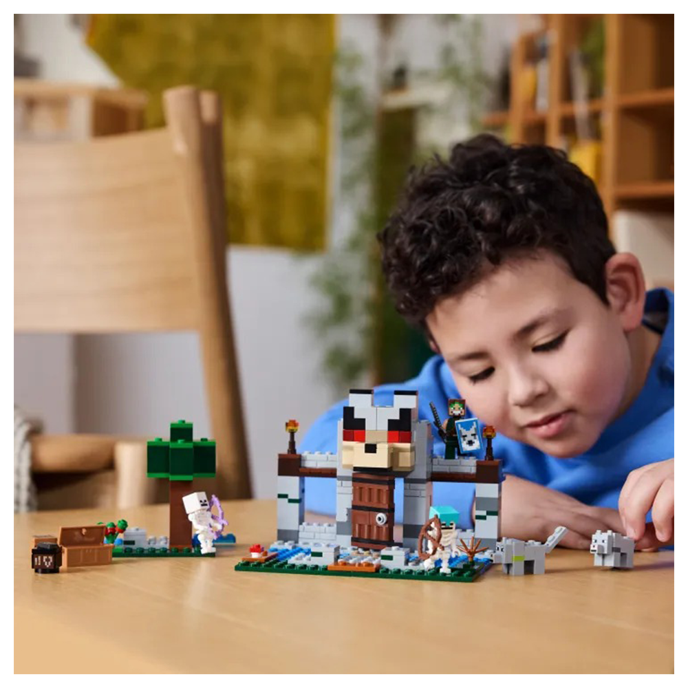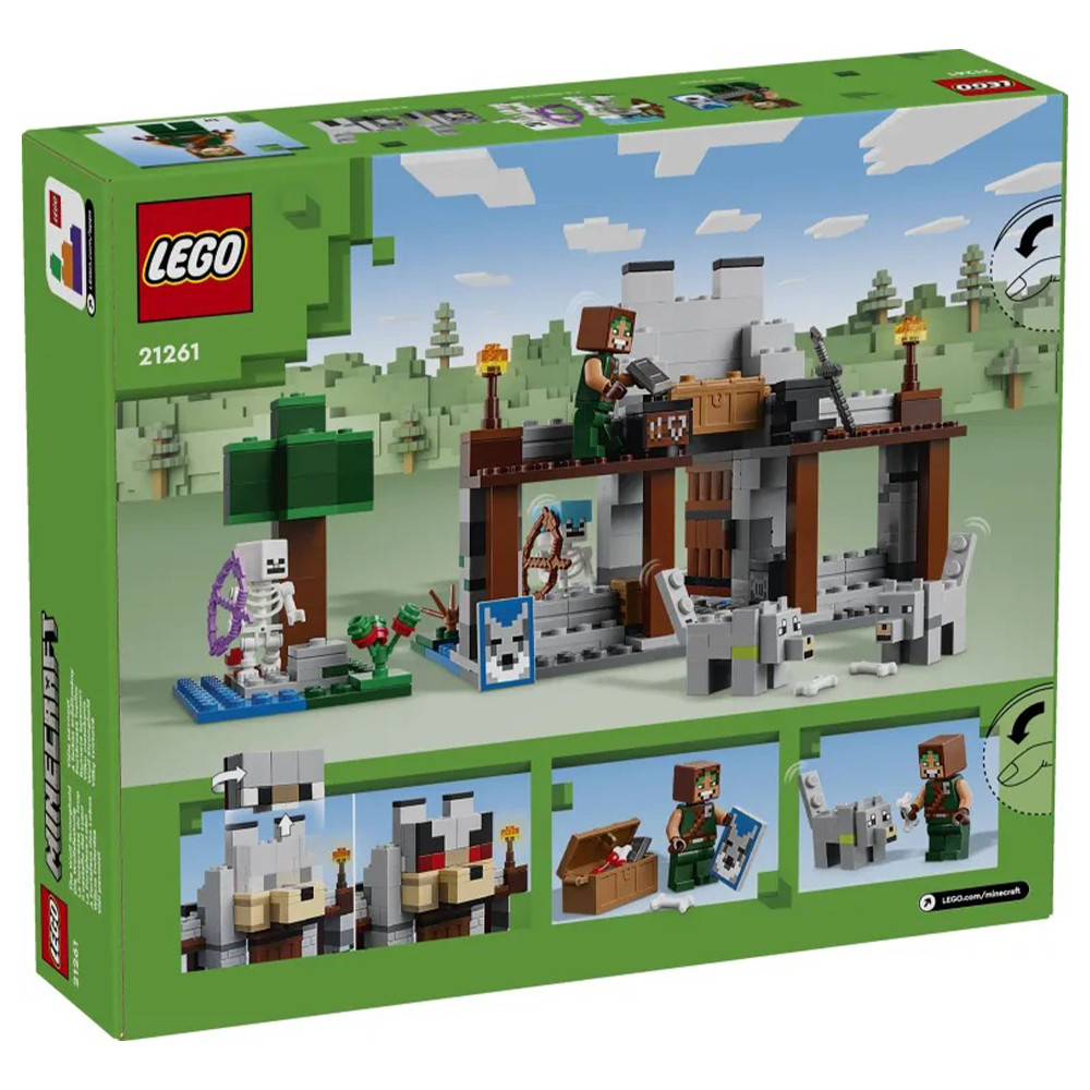 Τα παιδιά που αγαπούν τα σετ περιπέτειας και δράσης, τα παιχνίδια με φρούρια και τους Minecraft® χαρακτήρες θα ενθουσιαστούν με αυτό το LEGO® Minecraft The Wolf Stronghold (21261). Αυτό το Minecraft για παιδιά ηλικίας 8 ετών και άνω είναι εμπνευσμένο από το βιντεοπαιχνίδι και προσφέρει μια δημιουργική κατασκευή και δράση με ήρωα εξερευνητή και μάχες. Τα παιδιά κατασκευάζουν μια βάση με μεγάλο κεφάλι λύκου πάνω από την είσοδο για τον Δαμαστή Λύκων, και μετά διασκεδάζουν αλλάζοντας το πρόσωπο του λύκου από φιλικό σε θυμωμένο. Στο εσωτερικό υπάρχει τραπέζι κατασκευών, καμίνι, αμόνι και, για πρώτη φορά σε ένα σετ LEGO Minecraft, τραπέζι μεταλλουργίας. Ένα σεντούκι προμηθειών περιέχει ράβδο Εγκατίτη με την οποία τα παιδιά κατασκευάζουν ένα σπαθί, γλυκά μούρα και κόκαλα που χρησιμοποιούνται για την εξημέρωση του άγριου λύκου. Έξω υπάρχει ένα τμήμα δάσους με δέντρο, βράχο, μανιτάρι και θάμνο γλυκών μούρων. 2 Minecraft σκελετοί περιπλανώνται στο δάσος: ο ένας έχει ένα μαγεμένο τόξο και ο άλλος τόξο και βέλος και διαμαντένιο κράνος. Για επιπλέον ψηφιακή διασκέδαση, οι κατασκευαστές μπορούν να χρησιμοποιήσουν την απλή εφαρμογή LEGO Builder.