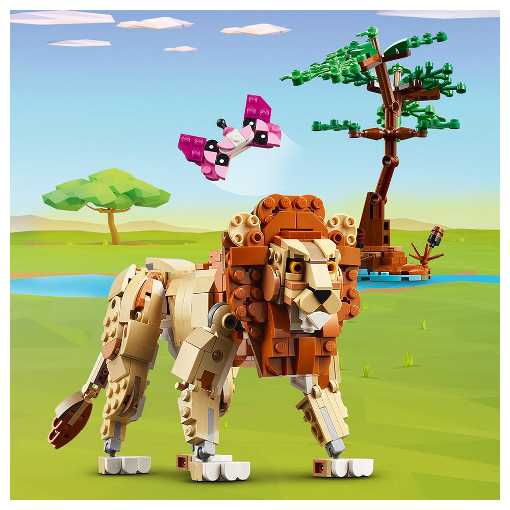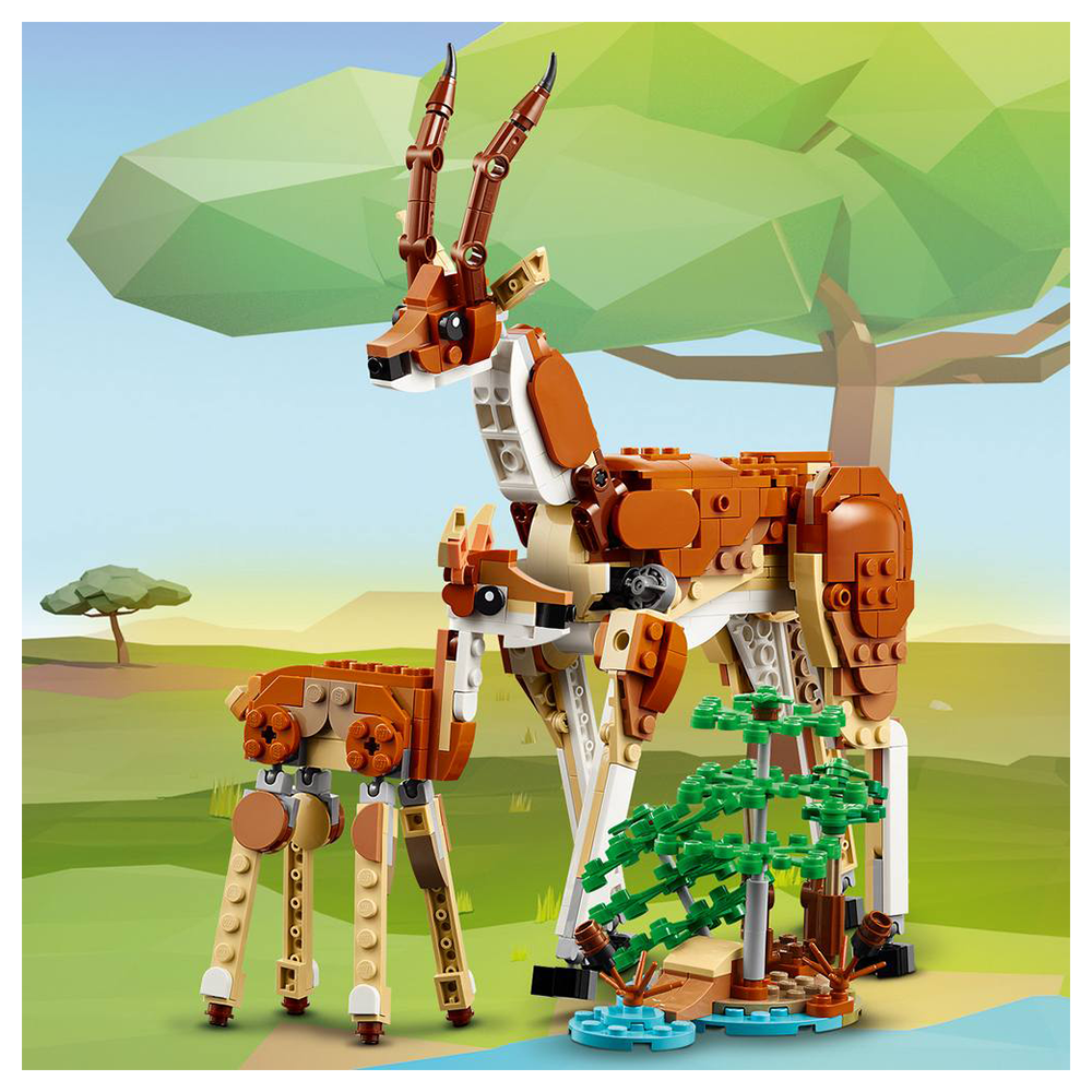 Με αυτό το σετ μπορείς να κάνεις ότι πηγαίνεις σε σαφάρι για να δεις μεγαλοπρεπή άγρια ζώα στο φυσικό τους περιβάλλον. Δες την κομψή καμηλοπάρδαλη που χαμηλώνει τον μακρύ της λαιμό για να χαιρετίσει ένα φλαμίνγκο. Για ακόμα περισσότερες περιπέτειες, ανακατασκεύασέ την σε μια γαζέλα που μαθαίνει στο μικρό της να περπατά, ή σε ένα φιλικό λιοντάρι που ξεκουράζεται στη σκιά ενός δέντρου με μια πεταλούδα. Τι θα κατασκευάσεις; Με αυτό το φανταστικό 3σε1 σετ, η επιλογή είναι δική σου.