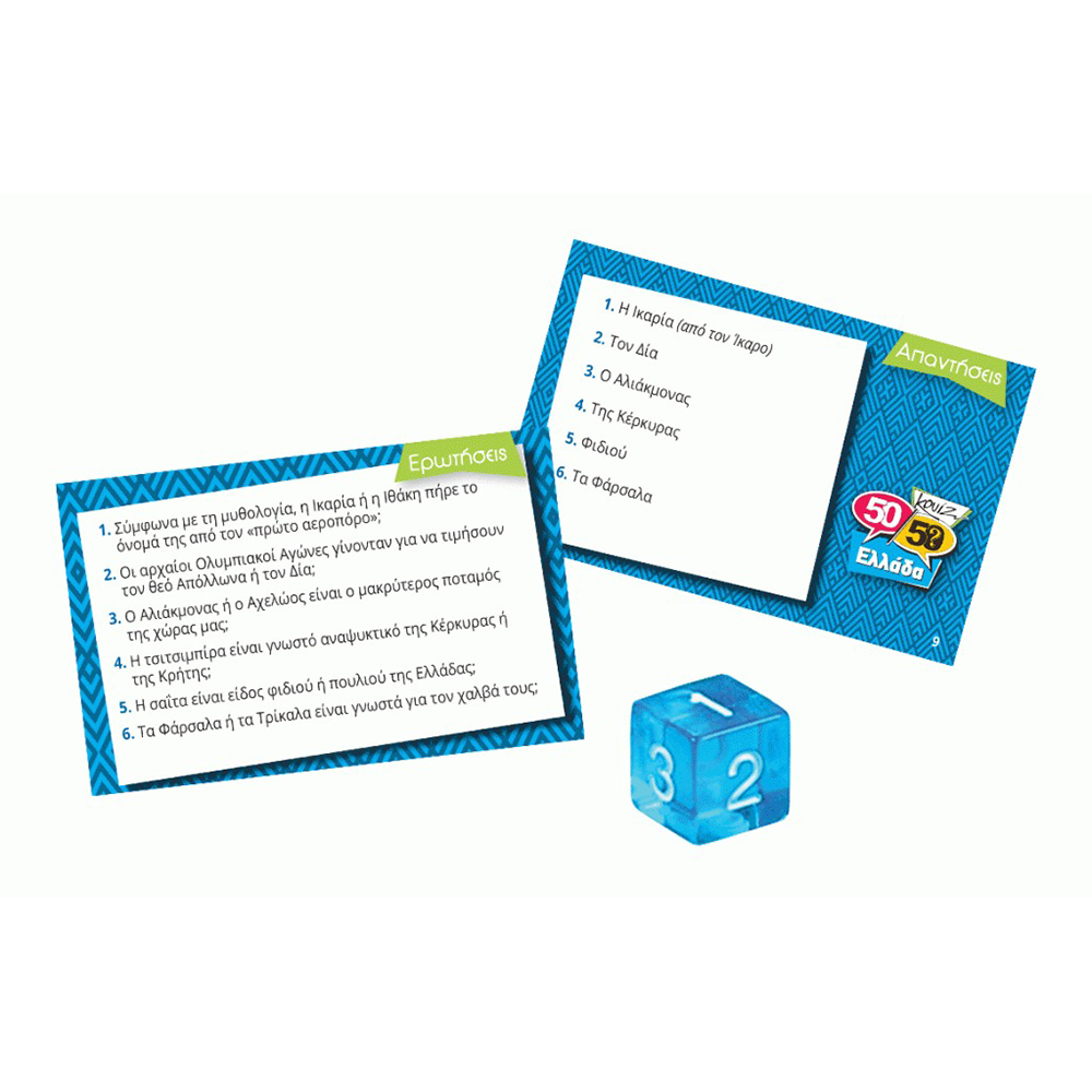 Πόσο καλά γνωρίζεις την Ελλάδα; Τέσταρε τις γνώσεις σου και συναγωνίσου τους φίλους σου με το νέο επιτραπέζιο ερωτήσεων 50-50 Κουίζ Ελλάδα! Με 600 ερωτήσεις που καλύπτουν ποικίλα θέματα, μαθαίνεις τις πιο ενδιαφέρουσες και αξιοπερίεργες πληροφορίες. Κανόνες: Ρίξε το ζάρι και απάντησε στην ερώτηση. Αν απαντήσεις σωστά, κράτησε την κάρτα. Αν απαντήσεις λάθος, βάλε την κάρτα πίσω στη θέση της. Μάζεψε όσες περισσότερες κάρτες μπορείς και γίνε ο νικητής!