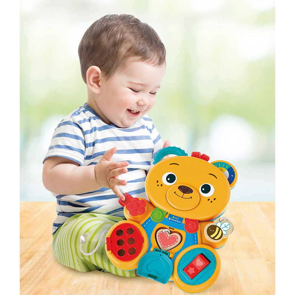 Ένα χαριτωμένο αρκουδάκι με σκληρά και απαλά στοιχεία και ξύλινες λεπτομέρειες. Ένα παιχνίδι εμπνευσμένο από τη μέθοδο Mοntessori, γεμάτο δραστηριότητες που έχουν σχεδιαστεί για να εκπαιδεύσουν την επιδεξιότητα ασκώντας τη συγκέντρωση : η κλωστή και οι κουμπότρυπες, ο διακόπτης που κάνει κλικ-κλακ, τα στοιχεία που αλληλοσυνδέονται, το άνοιγμα και το κλείσιμο της ζώνης και πολλά άλλα.