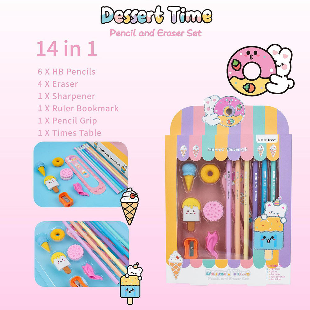 Σχολικό σετ με θέμα γλυκά. Περιλαμβάνει: 6 Μολύβια HB, 4 τρισδιάστατες γόμες, 1 ξύστρα, 1 λαβή μολυβιού, 1 σελιδοδείκτης.