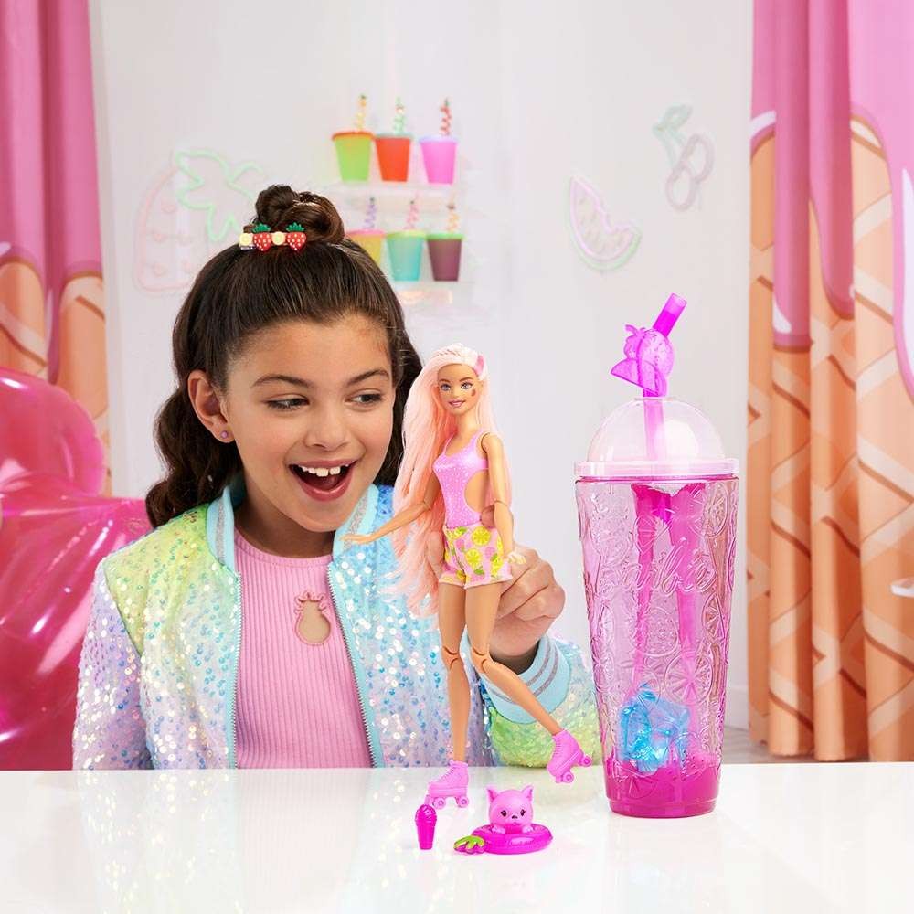 Οι κούκλες Barbie Pop Reveal προσφέρουν μια εμπειρία unboxing γεμάτη με οκτώ αισθητηριακές εκπλήξεις! Ξετυλίξτε τη συσκευασία εμπνευσμένη από το ποτήρι ποτού για να βρείτε την κούκλα με άρωμα Φράουλα & Λεμόνι στη σειρά Fruit. Ανοίξτε το καπάκι και αφαιρέστε τα σακουλάκια έκπληξη, στη συνέχεια ανοίξτε το επάνω μέρος και δείτε το πολύχρωμο Slime να στάζει πάνω από τα παγάκια που κρύβουν αξεσουάρ μέσα. Τα παιδιά μπορούν να βγάλουν το squishy Slime για διασκέδαση, αισθητηριακό παιχνίδι.